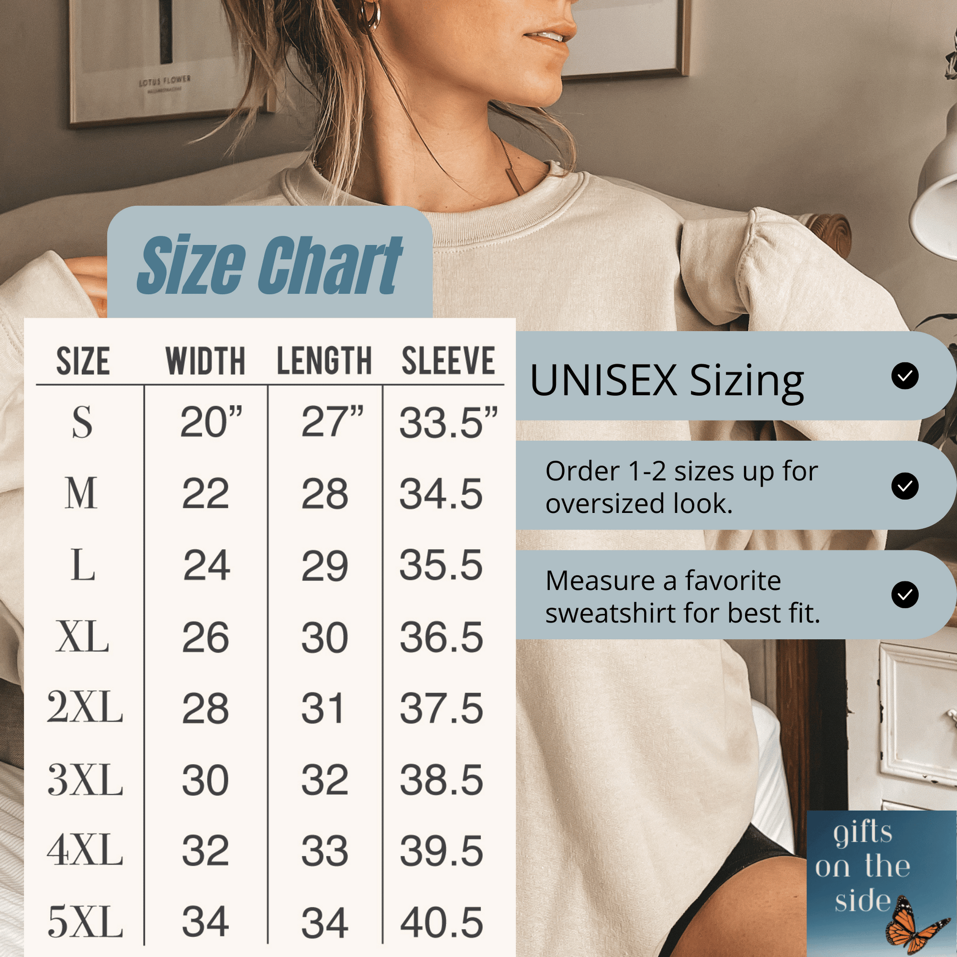 - Please see the unisex size chart guide and measure a favorite hoodie or crewneck from arm pit to arm pit to ensure size accuracy.